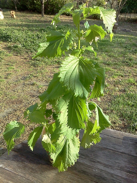 Et puis un pied de Shiso japonais issu d'une graine plantée il y a plus d'un an (au printemps 2010) fait ses premières fleurs. J'espère pouvoir obtenir de nouvelles graines. Le Shiso (Perilla frutescens) est de la même famille que la menthe, la sauge, la lavande...la famille des Lamiacées, reconnaissables, entre autre, à leurs tiges à section carrée.